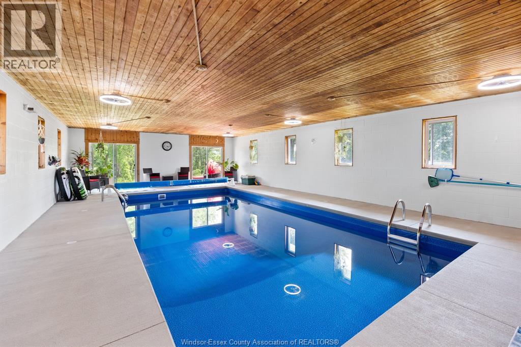 RELAX AND VACATION AT HOME IN THIS SPRAWLING BRICK TO ROOF RANCH SITUATED ON JUST UNDER 1 ACRE PEACEFUL AND QUIET CUL-DE-SAC ROAD FEATURING AN OVERSIZED BRIGHT LIVING ROOM, GORGEOUS WRAPAROUND GRANITE, CERAMIC AND STAINLESS ACCENTED KITCHEN (2026) WITH SEPARATE DINING AREA, DOUBLE GARDEN DOORS TO PRIVATE PATIO, 3 GENEROUS SIZED BEDROOMS, 2 RENOVATED BATHROOMS (2025) LOWER LEVEL FAMILY ROOM (2022) OFFICE/DEN, BONUS INDOOR SWIMMING POOL (2024) WITH SPA SIZED SAUNA AND SEPARATE WASHROOM, MULTIPLE WINDOWS PLUS PATIO DOORS (2025) LEAD TO A CUSTOM LOUNGING DECK OVERLOOKING A BREATHTAKING MANICURED TREED YARD BACKING ONTO THE RUSCOM RIVER AND PARKLAND WITH ACCESS TO WALKING TRAILS IN THE MEMORIAL PARK, 2 1/2 CAR GARAGE WITH SEPARATE TOOL ROOM, DOUBLE WIDE CEMENT DRIVE WITH EXTRA SIDE PARKING PAD (2023) FORCED AIR GAS FURNACE (2022) CENTRAL AIR, HARDWOOD FLOORS, MAIN FLOOR LAUNDRY, APPLIANCES INCLUDED, VINYL REPLACEMENT WINDOWS AND DOORS (2023, 2025) COUNTY LIVING WITH EASY ACCESS TO WINDSOR FROM HWY 401 OR COUNTY ROAD 42 (id:63285)