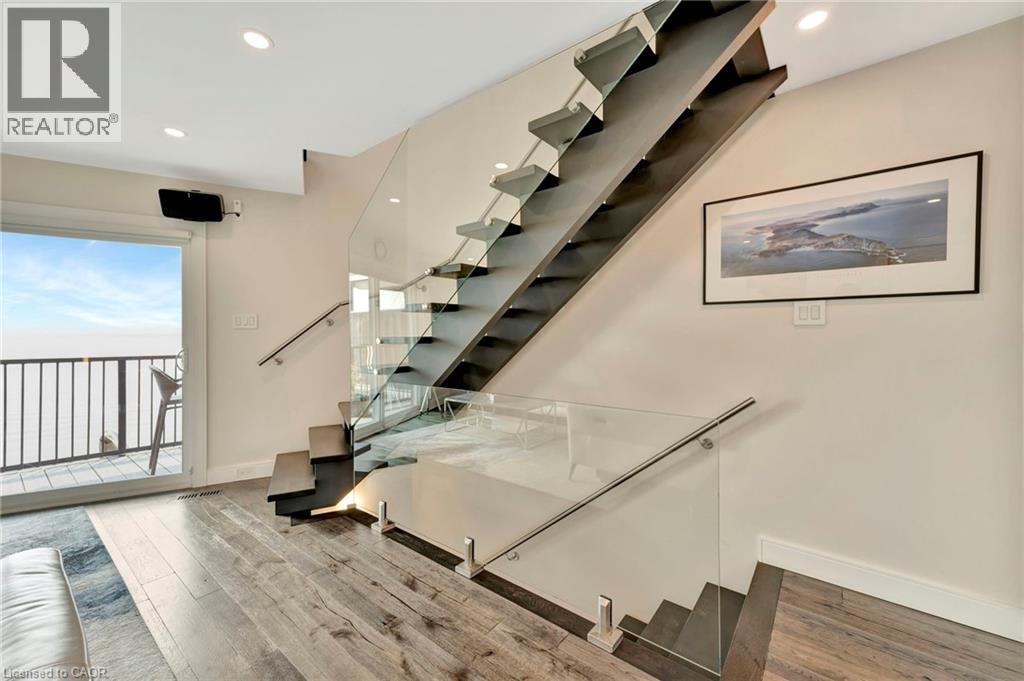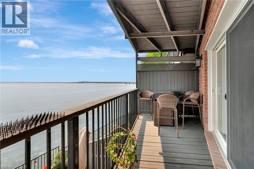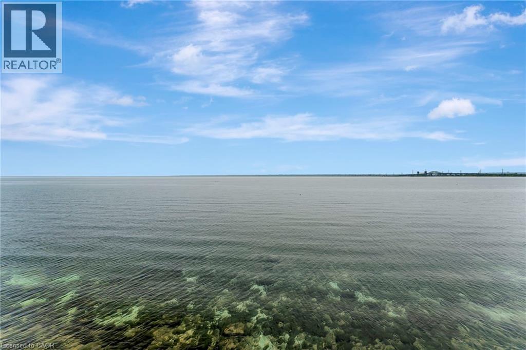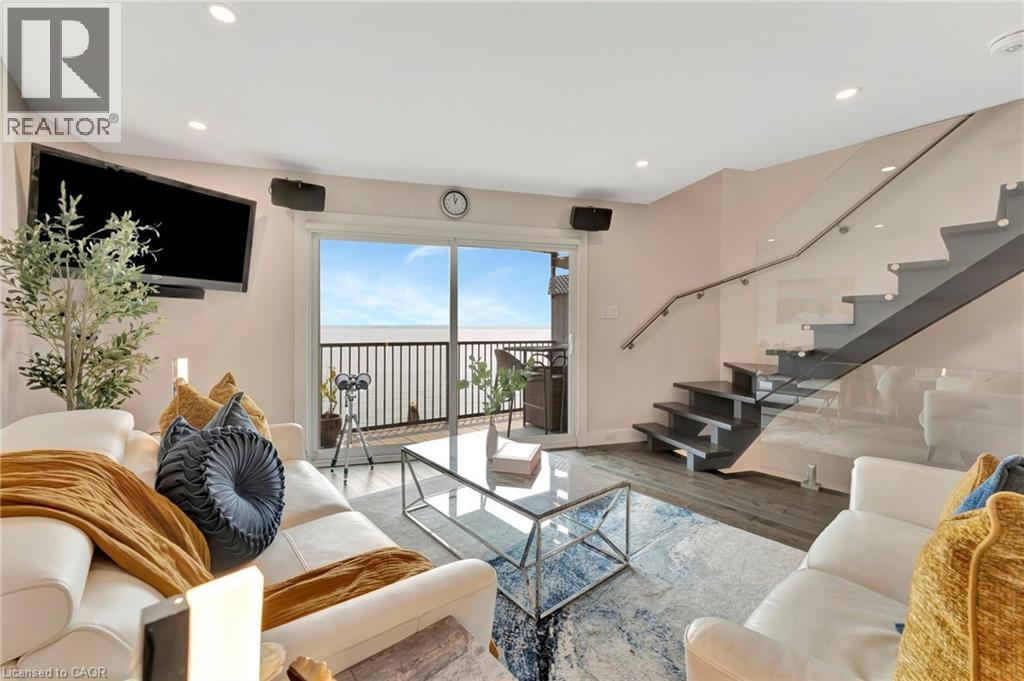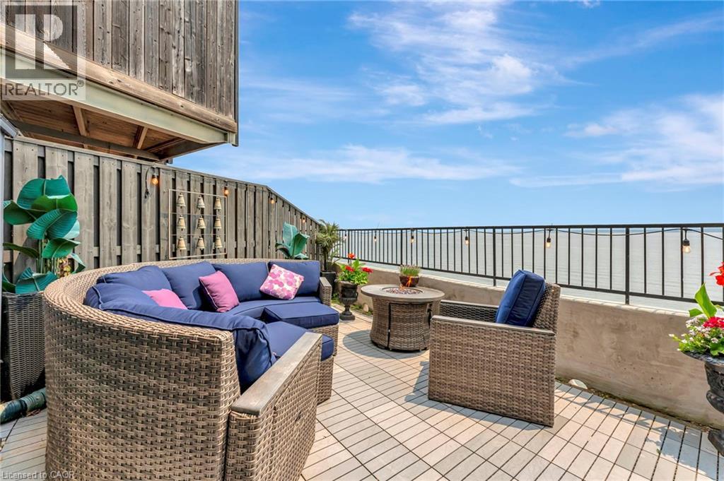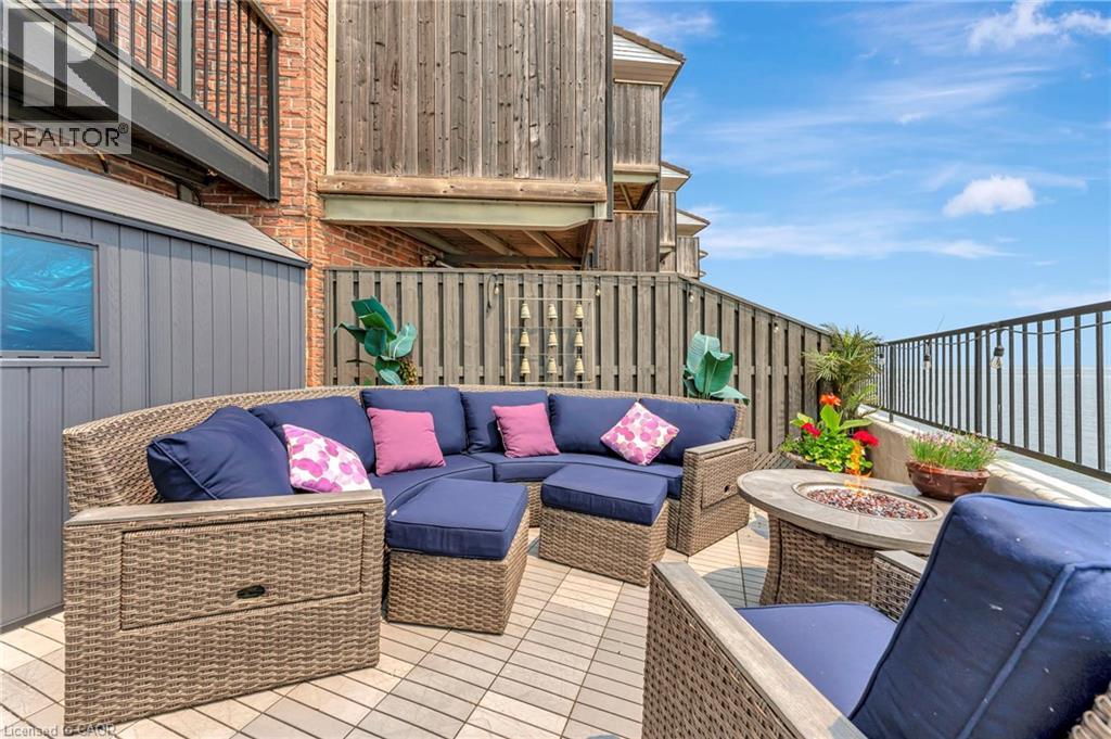 Welcome to the ultimate lakefront lifestyle. This fully renovated 3-level townhouse hass unobstructed, panoramic views of Lake Ontario so close to the water, you can practically dip your toes in. Located just 600 metres from downtown Burlington, this is a rare blend of tranquility and convenience. This 3-level townhouse (1,600 plus SF) has 1 bedrooms (potential for 2nd if you converted large walk-in closet back into a bedroom), 3 bathrooms (2 full, 1 powder) and 4 separate patio/terraces (huge 400 SF lower terrace at the water's edge). In 2020 this unit was completely gutted to the studs and rebuilt by the renowned Bespoke Home Solutions with a total renovation budget exceeding $500K . The gourmet kitchen has been masterfully crafted with designer finishes including: Insinkerator food waste disposal, hot water tank/dispenser, Porter & Charles warming drawer, Built in Miele Appliances (including a $7K plumbed in Coffee Machine), microwave/convection oven, Combi Steam Oven, Dacor Fridge & Freezer and Gravelle custom cabinetry throughout. The spacious primary suite is a true retreat, featuring a spa-inspired ensuite with heated floors, a two-person soaker tub, and a private balcony with stunning sunrise views over the lake. The second bedroom has been converted into a designer walk-in closet with custom cabinetry and a centre island (easily reverted to a bedroom if desired). Lower level family room has a full bathroom, ample storage and ability to have a guest suite with use of a murphy bed. Backwater valve in basement. Home is equipped with Sonos built in ceiling speakers with hooked up amplifiers and speaker selector options. Large 400 SF back terrace is fashioned with a BBQ gas line and has a hook up for a Hot Tub. (id:63285)