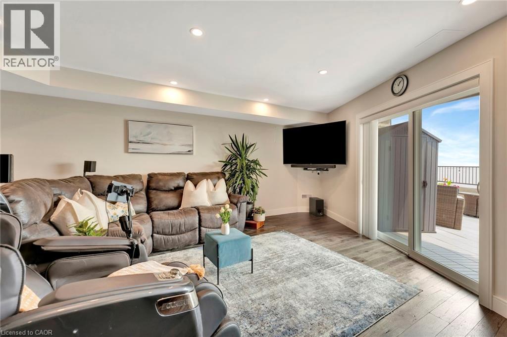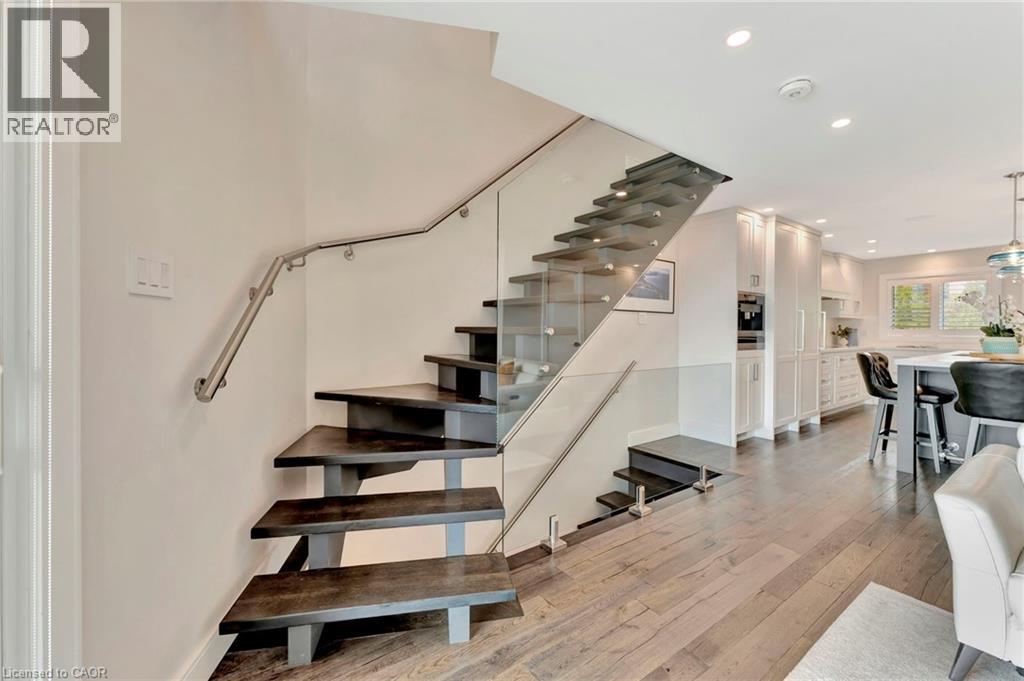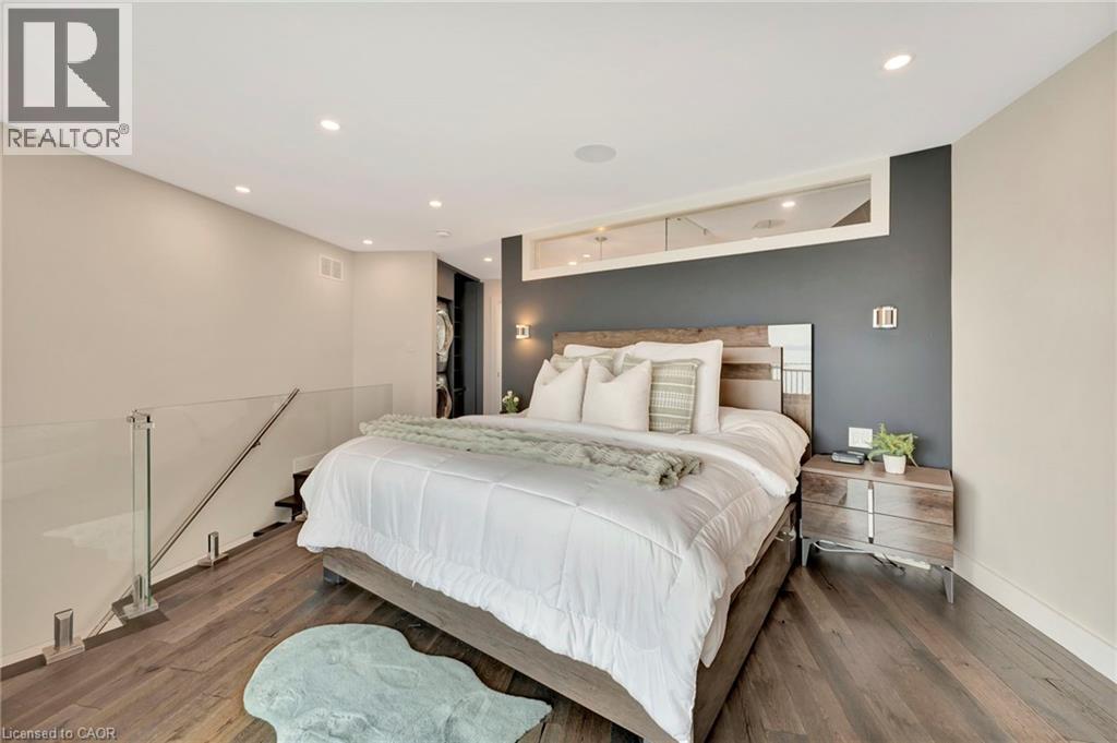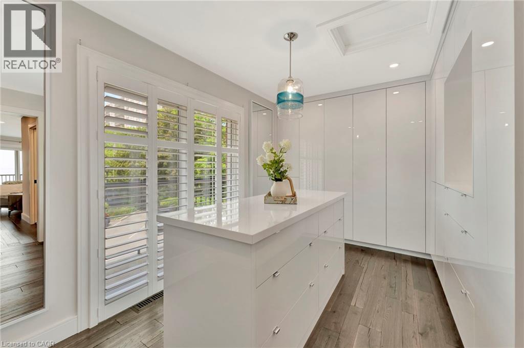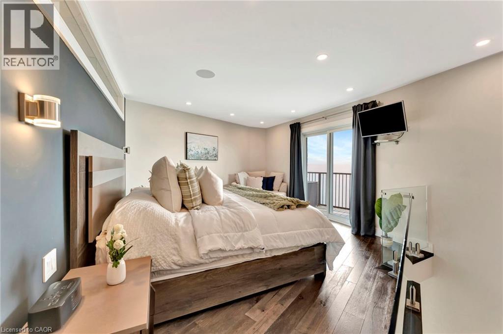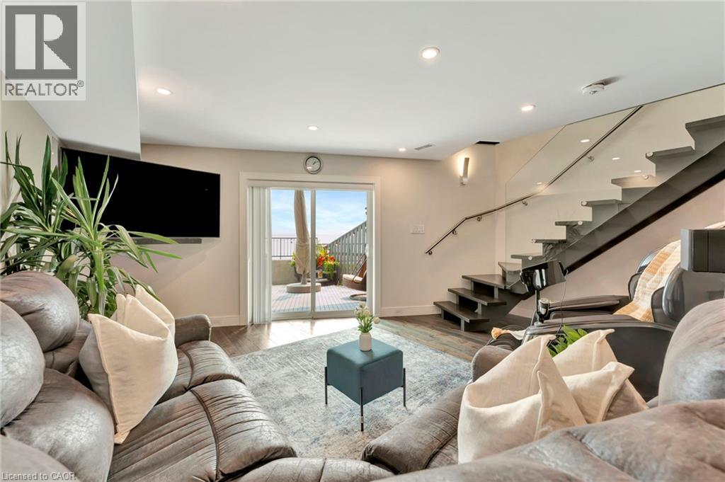 Welcome to the ultimate lakefront lifestyle. This fully renovated 3-level townhouse hass unobstructed, panoramic views of Lake Ontario so close to the water, you can practically dip your toes in. Located just 600 metres from downtown Burlington, this is a rare blend of tranquility and convenience. This 3-level townhouse (1,600 plus SF) has 1 bedrooms (potential for 2nd if you converted large walk-in closet back into a bedroom), 3 bathrooms (2 full, 1 powder) and 4 separate patio/terraces (huge 400 SF lower terrace at the water's edge). In 2020 this unit was completely gutted to the studs and rebuilt by the renowned Bespoke Home Solutions with a total renovation budget exceeding $500K . The gourmet kitchen has been masterfully crafted with designer finishes including: Insinkerator food waste disposal, hot water tank/dispenser, Porter & Charles warming drawer, Built in Miele Appliances (including a $7K plumbed in Coffee Machine), microwave/convection oven, Combi Steam Oven, Dacor Fridge & Freezer and Gravelle custom cabinetry throughout. The spacious primary suite is a true retreat, featuring a spa-inspired ensuite with heated floors, a two-person soaker tub, and a private balcony with stunning sunrise views over the lake. The second bedroom has been converted into a designer walk-in closet with custom cabinetry and a centre island (easily reverted to a bedroom if desired). Lower level family room has a full bathroom, ample storage and ability to have a guest suite with use of a murphy bed. Backwater valve in basement. Home is equipped with Sonos built in ceiling speakers with hooked up amplifiers and speaker selector options. Large 400 SF back terrace is fashioned with a BBQ gas line and has a hook up for a Hot Tub. (id:63285)