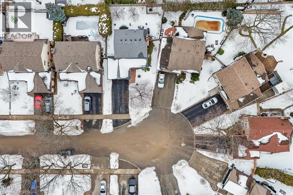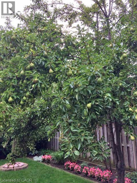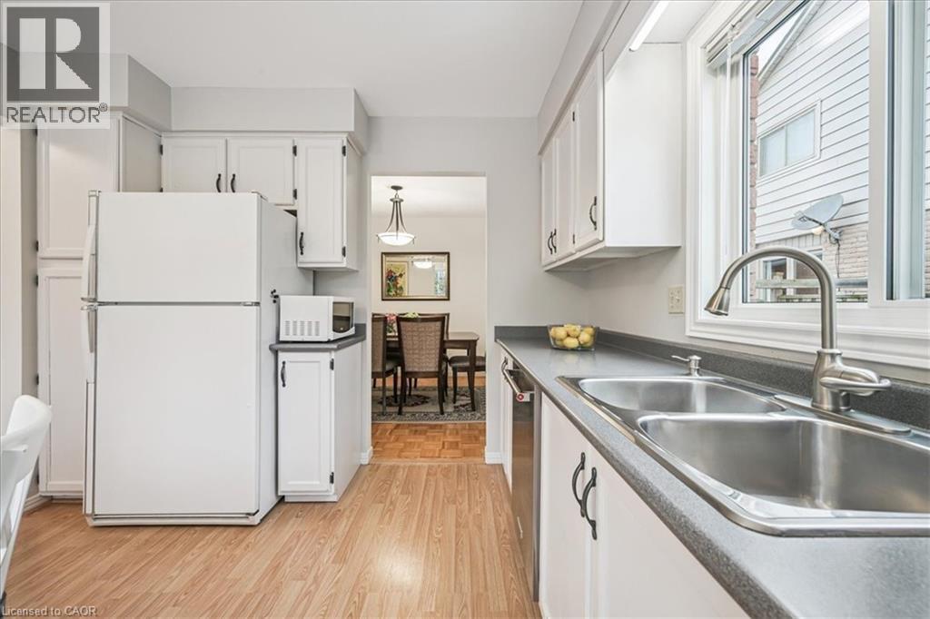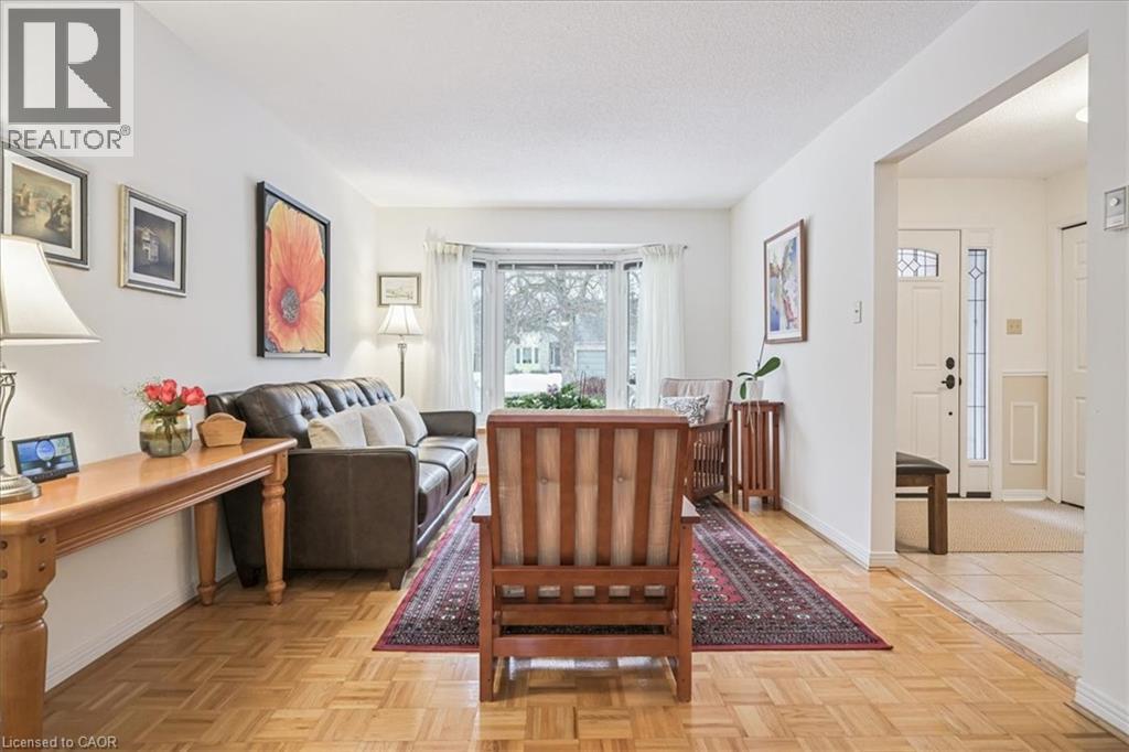 Nestled at the top of a quiet court in central Burlington, this beautifully maintained Monarch-built family home offers 3+1 bedrooms, 3.5 bathrooms and approx. 2,432 sq. ft. of finished living space including the basement. An ideal location for families and commuters alike, just an 8-minute walk to Tom Thomson Public School and minutes to downtown Burlington's shops, restaurants, waterfront, Spencer Smith Park, Brant Street Pier, Art Gallery of Burlington and Joseph Brant Hospital. Quick access to Burlington GO Station and Hwy 403, with Costco and Walmart close by.Curb appeal is exceptional with a double driveway, parking for four vehicles, attached double garage, interlocking stone curbing, manicured gardens and a welcoming stone walkway. The private backyard is a tranquil retreat featuring a spacious interlocking patio, mature trees, lush perennial gardens and a fruit-bearing pear tree-perfect for entertaining or enjoying quiet summer evenings.Inside, a striking oak staircase with black metal spindles anchors the foyer. The formal living room with parquet flooring flows through French doors into the warm family room with gas fireplace and walkout to the patio. The bright eat-in kitchen offers ample white cabinetry, stainless steel appliances (except fridge), updated laminate flooring and a generous breakfast area with treetop views. A separate dining room and convenient 2-piece bath complete the main level.Upstairs, hardwood flooring (2021) extends throughout the hallway, bedrooms and closets. The primary suite features a walk-in closet and private 3-piece ensuite, while two additional bedrooms share the main 4-piece bath. The finished lower level offers a versatile rec/media room with wide-plank laminate flooring (2022), a fourth bedroom or home office, and a full 3-piece bath. Numerous updates including roof shingles, windows (except patio door), front and rear doors, furnace and A/C complete this move-in ready home in a premium court location. (id:63285)